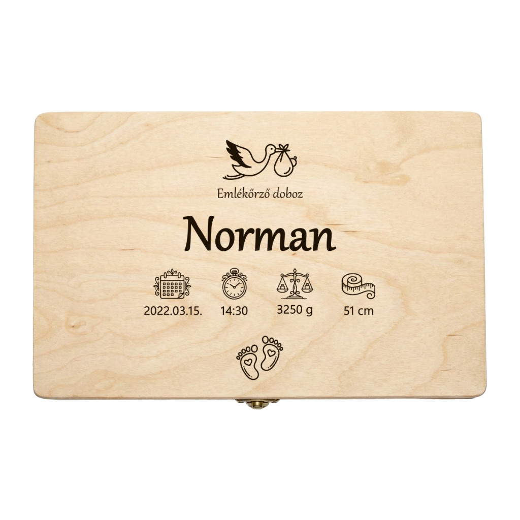 A mintán a gólya és a pici lábnyomok mellett ikonok jelölik a személyre szabható adatokat: születési dátum, idő, súly és hossz – így a doboz egy igazi “születési emléklap” is egyben, csak épp időtálló fából, gyönyörű gravírozással. Tökéletes választás újszülött ajándéknak, babalátogatásra, keresztelőre, 1. születésnapra, vagy akár a saját családi emlékek rendszerezéséhez.