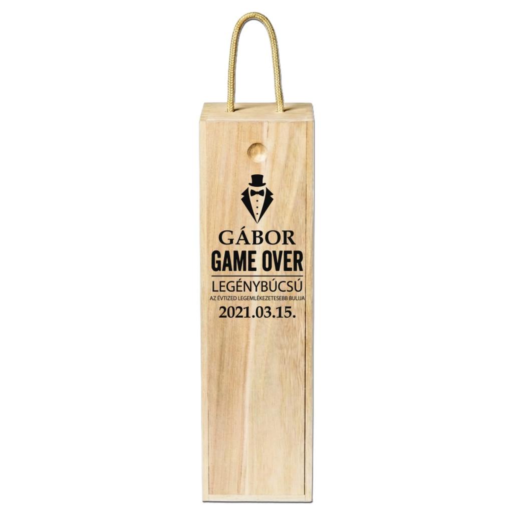 Készültök a nagy estére, és kell egy ajándék, ami vicces, menő és örök emlék marad? Ez a „Game Over – Legénybúcsú” feliratú, egyedileg gravírozott fa boros doboz pont erre való: a vőlegény neve és a legénybúcsú dátuma rákerül a dobozra, így tényleg olyan, mintha direkt neki készült volna.
