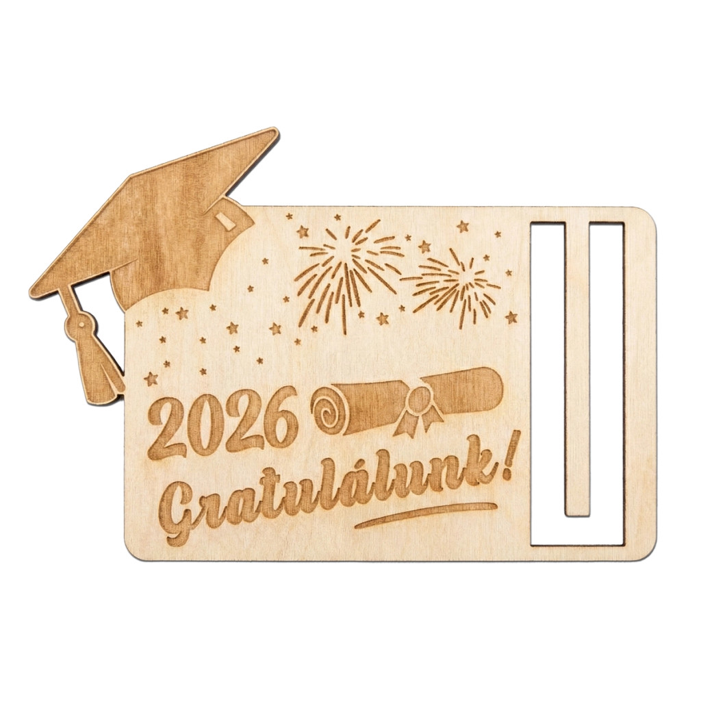 A praktikus kialakítású nyílás lehetővé teszi, hogy bankjegyet vagy utalványt rögzíts rajta – így nemcsak szép, de funkcionális is. Tökéletes választás általános, középiskolai vagy egyetemi ballagásra, fiúknak és lányoknak egyaránt.