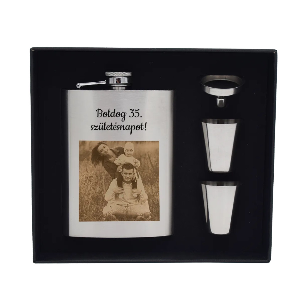 Ajándékozz igazán emlékezetes meglepetést ezzel az elegáns rozsdamentes acél flaska szettel, amelyet egyedi fotóval és szöveggel gravírozunk. A szett tartalmaz egy 230 ml-es rozsdamentes acél flaskát, két darab feles poharat és egy praktikus tölcsért a könnyű használatért.