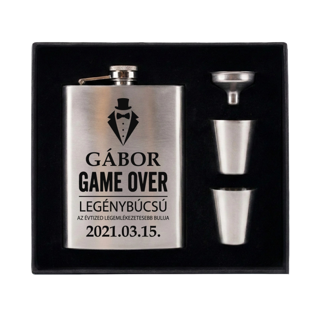 Ha legénybúcsúra keresel olyan ajándékot, ami menő, vicces és maradandó, ez a gravírozott flaska szett telitalálat. A laposüvegen elegáns, „öltönyös” ikon mellett a felirat: „GAME OVER – LEGÉNYBÚCSÚ”, alatta pedig egy ütős kiegészítés: „Az évtized legemlékezetesebb bulija”. A legjobb rész, hogy a minta személyre szabható: felkerülhet rá a vőlegény neve (pl. Gábor) és a legénybúcsú dátuma (pl. 2021.03.15.), így tényleg egyedi emlék marad a nagy estéről.