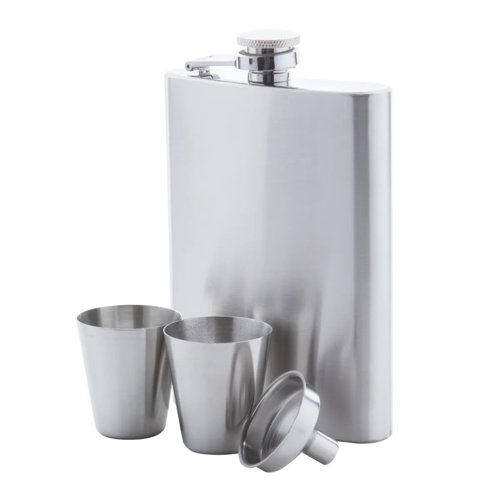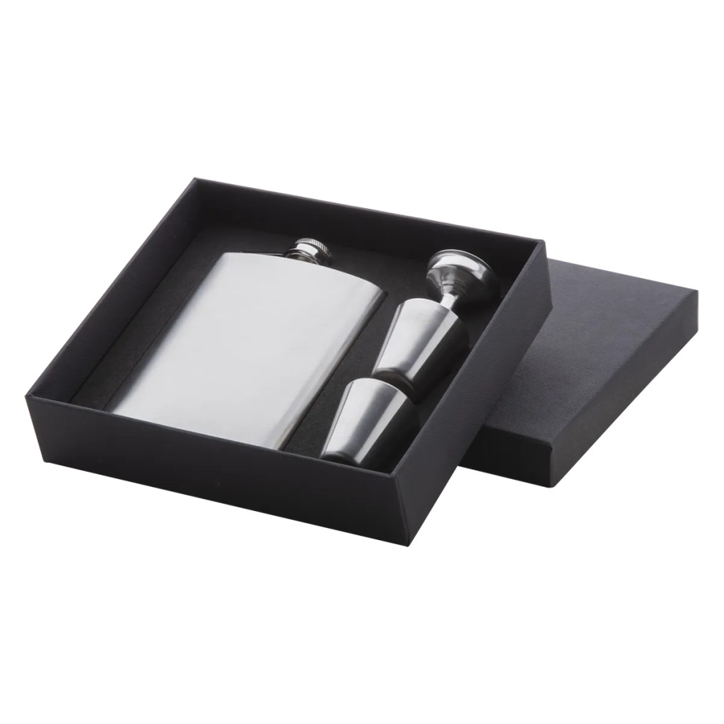 A szett minden fontos kiegészítőt tartalmaz: a 230 ml-es rozsdamentes laposüveg mellé két feles pohár és egy tölcsér is jár, mindez pedig igényes fekete díszdobozban érkezik – ajándékba adni tökéletes.